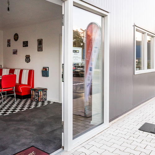 Im Eingangsbereich wurde in der Fahrzeughalle neben der hochwertigen PACO Kunststofftür eine seitliche Verglasung angebracht.